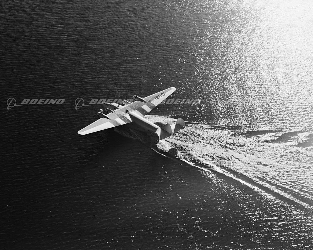 The whale-shaped Boeing Model 314 flying boat took cruise ship elegance into the air. Luxurious amenities aboard the Clipper included a stylish lounge, a dining salon, and a bridal suite. At 106 feet long with a 152-foot wingspan, it was the largest passenger transport in its time. At night, 74 seats converted into 40 bunks. It first flew in 1938 and on June 28, 1939, made the first scheduled transatlantic flight. In 1943, President Franklin Delano Roosevelt celebrated his birthday on a Model 314 airplane, flying to Casablanca and back, becoming the first U.S. president to fly while in office