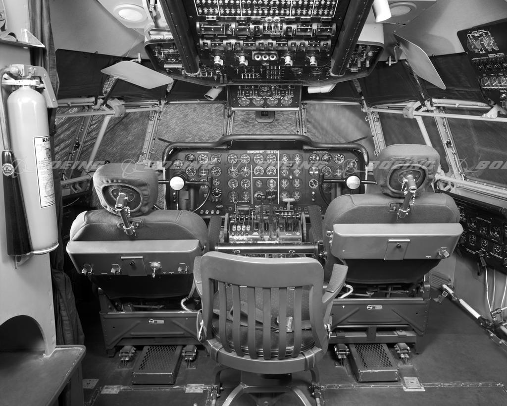 The 377 Stratocruiser was the last of the Boeing propeller-powered luxury airliners. Known as the First Lady of the Airways, it first flew in 1947 as the elegant, civilian offspring of the C-97, a military freighter that carried soldiers and equipment during World War II. A circular stairway led from the cabin to a lower deck luxury lounge. As a sleeper, it held 28 upper- and lower-bunk units. The first Stratocruiser began service in 1949 between San Francisco to Honolulu. Only five years later, the Boeing Dash 80 prototype for the Model 707 made its first flight, and the Stratocruiser became obsolete. It found a new career as special transport for large sections of spacecraft. With its fuselage swollen by a superstructure, the once-elegant Stratocruiser became known as the Pregnant Guppy and, even larger, as the Super Guppy.
