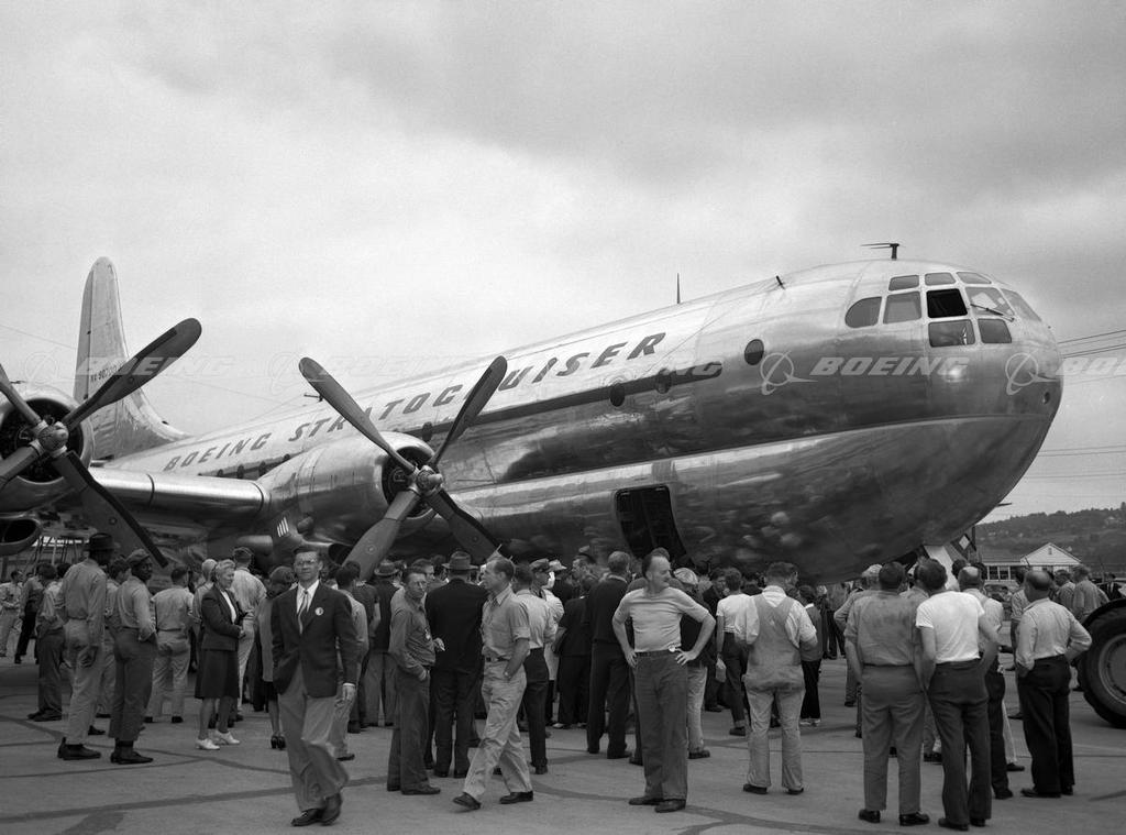The 377 Stratocruiser was the last of the Boeing propeller-powered luxury airliners. Known as the First Lady of the Airways, it first flew in 1947 as the elegant, civilian offspring of the C-97, a military freighter that carried soldiers and equipment during World War II. A circular stairway led from the cabin to a lower deck luxury lounge. As a sleeper, it held 28 upper- and lower-bunk units. The first Stratocruiser began service in 1949 between San Francisco to Honolulu. Only five years later, the Boeing Dash 80 prototype for the Model 707 made its first flight, and the Stratocruiser became obsolete. It found a new career as special transport for large sections of spacecraft. With its fuselage swollen by a superstructure, the once-elegant Stratocruiser became known as the Pregnant Guppy and, even larger, as the Super Guppy.
