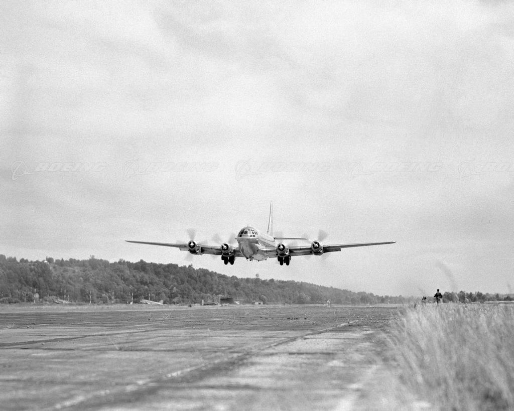 The 377 Stratocruiser was the last of the Boeing propeller-powered luxury airliners. Known as the First Lady of the Airways, it first flew in 1947 as the elegant, civilian offspring of the C-97, a military freighter that carried soldiers and equipment during World War II. A circular stairway led from the cabin to a lower deck luxury lounge. As a sleeper, it held 28 upper- and lower-bunk units. The first Stratocruiser began service in 1949 between San Francisco to Honolulu. Only five years later, the Boeing Dash 80 prototype for the Model 707 made its first flight, and the Stratocruiser became obsolete. It found a new career as special transport for large sections of spacecraft. With its fuselage swollen by a superstructure, the once-elegant Stratocruiser became known as the Pregnant Guppy and, even larger, as the Super Guppy.
