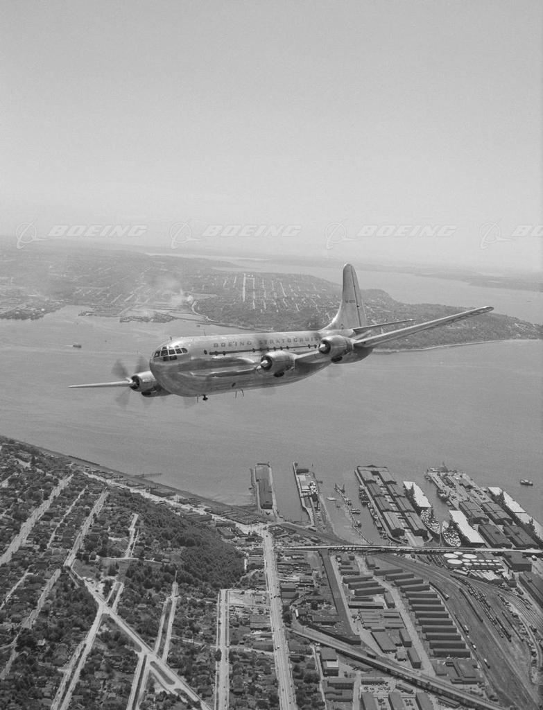 The 377 Stratocruiser was the last of the Boeing propeller-powered luxury airliners. Known as the “First Lady of the Airways,” it first flew in 1947 as the elegant, civilian offspring of the C-97, a military freighter that carried soldiers and equipment during World War II. A circular stairway led from the cabin to a lower deck luxury lounge. As a sleeper, it held 28 upper- and lower-bunk units. The first Stratocruiser began service in 1949 between San Francisco to Honolulu. Only five years later, the Boeing “Dash 80” prototype for the Model 707 made its first flight, and the Stratocruiser became obsolete. It found a new career as special transport for large sections of spacecraft. With its fuselage swollen by a superstructure, the once-elegant Stratocruiser became known as the “Pregnant Guppy” and, even larger, as the “Super Guppy.”