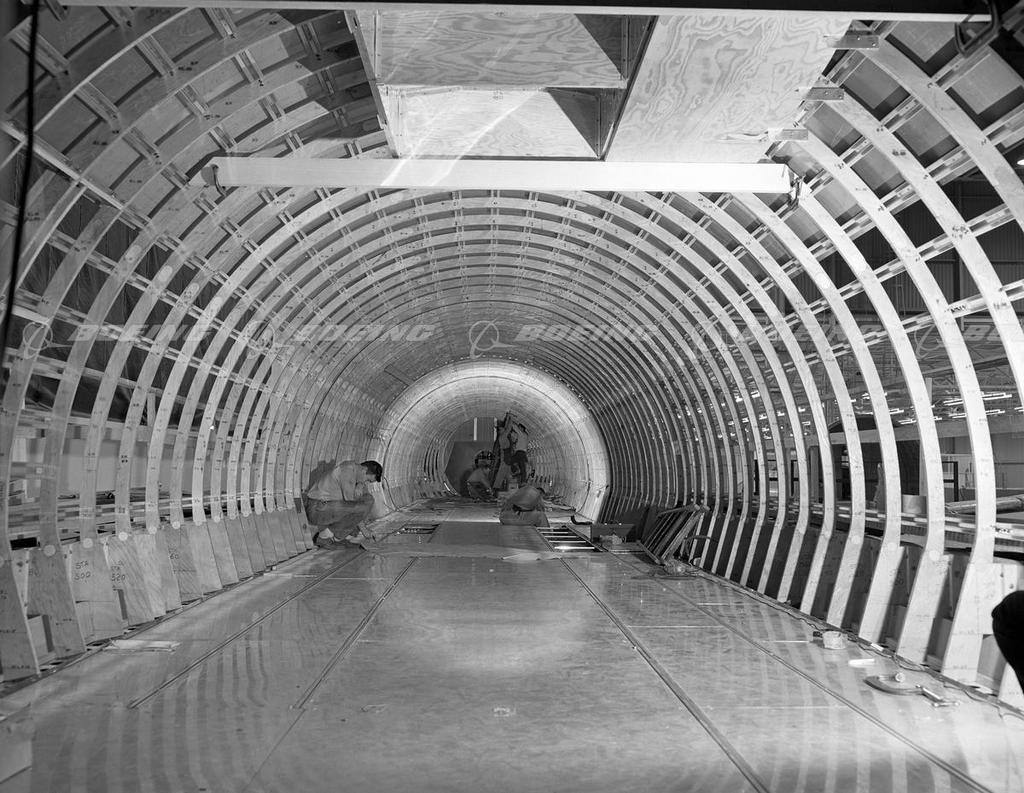After the Air Force agreed to let Boeing build commercial jets based on the prototype 367-80, already the basis for the KC-135 military tanker, airlines began to order the 707, the commercial transport variant of the Dash 80. The 707 and the KC-135 had many features in common. Both were visually distinct, with a stinger antenna pointing forward from the top of their vertical fin. The 707's width and 100-foot length made it the largest passenger cabin in the air at the time. Placement of its more than 100 windows allowed airlines to rearrange seats. Location of passenger doors on the left side, at the front and at the rear of the cabin, became standard for subsequent Boeing jets. The exteriors of the 707 and its competitor, the DC-8, were almost identical, but the 707 wing had more sweepback, so it could fly about 20 mph faster.