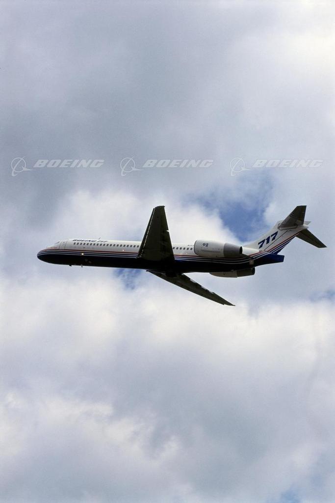 The 717 is a full-size twinjet designed specifically for the short-range, 100-seat regional airline market and is a very efficient and exceptionally quiet airplane. Its advanced technologies and rugged simplicity of design allow it quick turnaround time at a wide range of airports, so crew and passengers spend less time on the ground. It makes effective use of today's technology to lower operating costs, reduce noise and emissions, and provide big jet comfort. The airplane, formerly MD-95, was designated the Boeing 717 following the merger of McDonnell Douglas and The Boeing Company in 1997. In early 2005, after careful assessment of the challenging 100-seat market, Boeing announced that it will conclude 717 production in 2006 after delivering on current customer commitments.