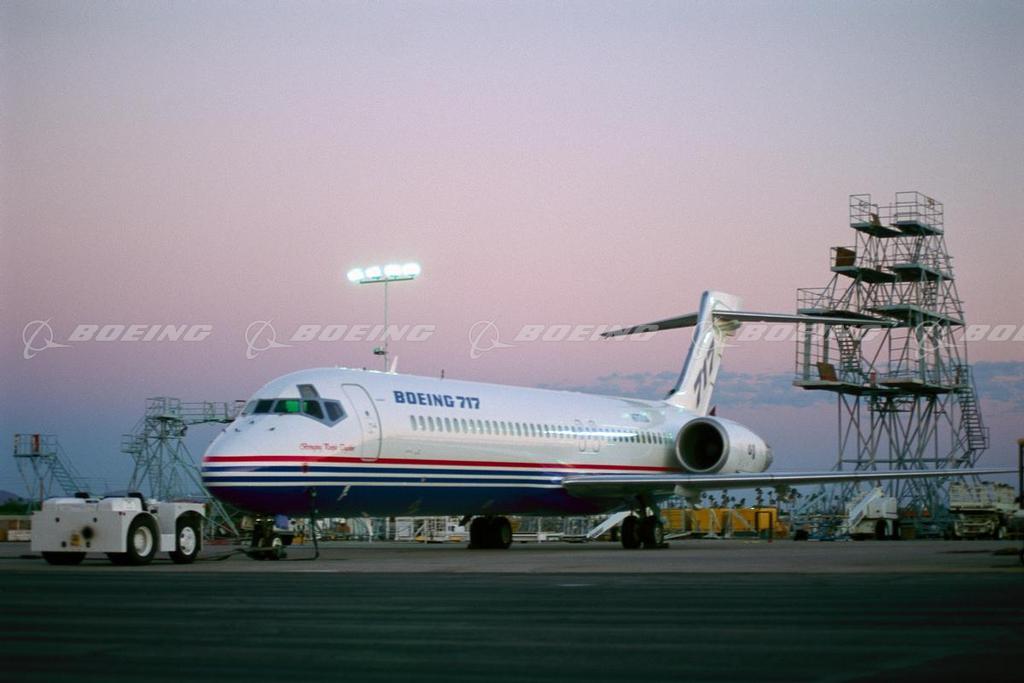The 717 is a full-size twinjet designed specifically for the short-range, 100-seat regional airline market and is a very efficient and exceptionally quiet airplane. Its advanced technologies and rugged simplicity of design allow it quick turnaround time at a wide range of airports, so crew and passengers spend less time on the ground. It makes effective use of today's technology to lower operating costs, reduce noise and emissions, and provide big jet comfort. The airplane, formerly MD-95, was designated the Boeing 717 following the merger of McDonnell Douglas and The Boeing Company in 1997. In early 2005, after careful assessment of the challenging 100-seat market, Boeing announced that it will conclude 717 production in 2006 after delivering on current customer commitments.