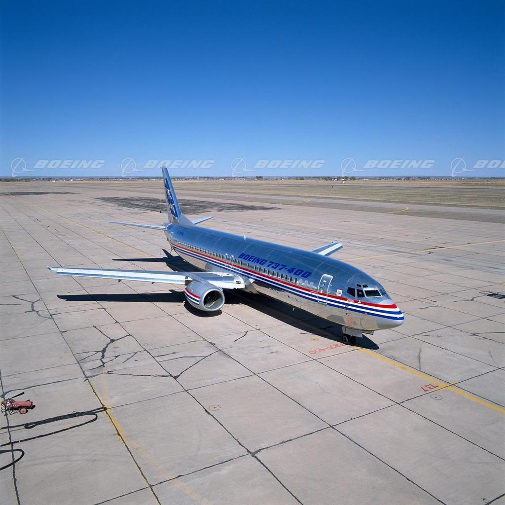 Development of the quieter, more fuel-efficient CFM56-3 series of engines allowed Boeing to improve its most popular jetliners and produce the advanced-technology 737-330, -400, and -500. The engines are larger and mounted forward of the wing struts instead of tucked directly under the wing as in the -100 and -200 versions. Advancements on the new-generation 737s included a stregthened wing to accomodate greater gross weight, tip extensions to the wings and horizontal stabilizers, and stregthened wheels, tires and brakes. The 737-200, -300, -400, -500 have the same handling characteristics so that pilots can use the same Type rating to fly all of them. Airlines' spares inventory and maintenance are simplified by making a substantial number of replaceable parts on the -300, -400, -500 identical to those used on the -200. The 737-400 is about 10 feet longer than the 737-300. It holds 19 more passengers and has a gross weight of up to 150,000 pounds, while retaining the same fuel efficiency, low noise, and low operating costs as its predecessor.