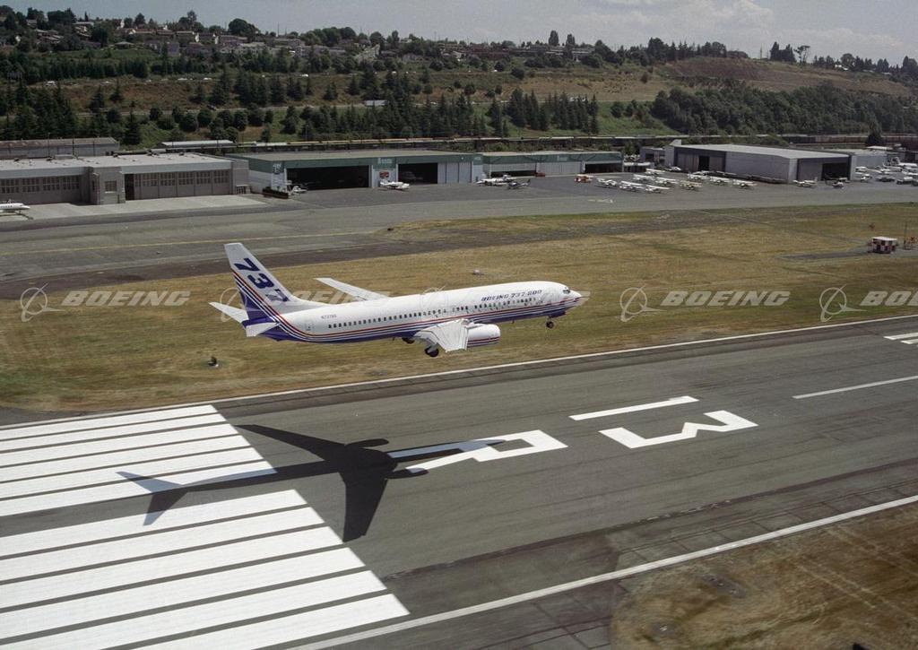 After a successful three hour and five minute first flight the longest 737 ever built approaches for landing at Boeing Field in Seattle. During the flight, pilots Capts. Mike Hewett and Jim McRoberts conducted a series of tests on the airplane's systems and structures. Using flight-test equipment on board the aircraft, information from the tests was recorded and the pilots transmitted data back to Flight Test personnel working at the control room at Boeing Field. The 129-foot, 6-inch 737-800 will go through a seven month flight test program before it is certified and delivered to German carrier Hapag-Lloyd in the spring of 1998.