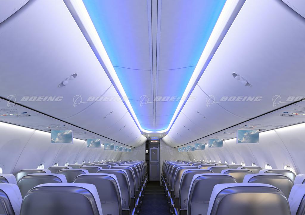 The Boeing Sky Interior offers more room in the cabin through sculpted sidewalls and window reveals, and new, larger stow bins that accommodate more bags while taking up less space. New, modern, sculpted sidewalls and window reveals direct the passengers’ eyes to the view outside the window --- the place where passengers say they most experience a thrilling sense of flying.
