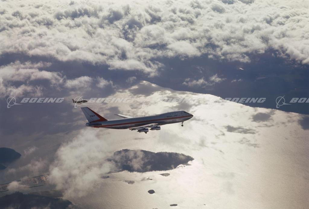 747-100 Banks Over Puget Sound with F-86 Chase Plane at its Side