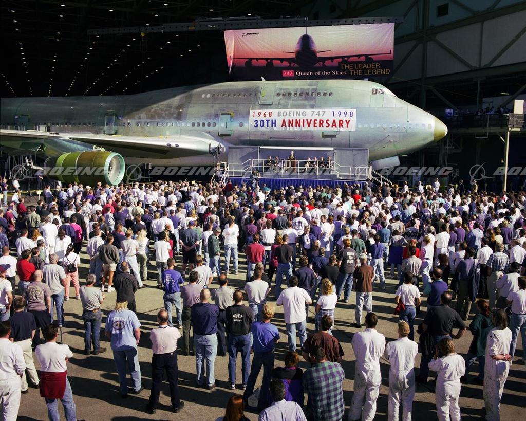 On September 30, 1998, Boeing celebrated the 30th anniversary of the first 747-100 to roll out of the Everett factory. A new 747 slogan is revealed at the ceremony: "Boeing 747 -- The Leader, The Legend."
