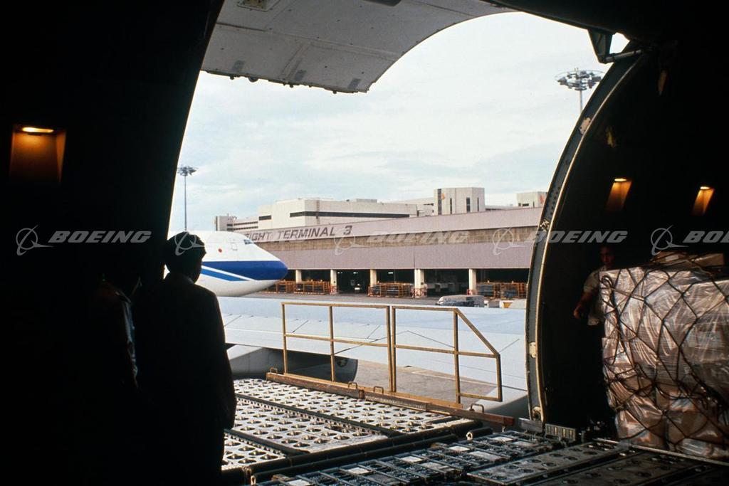 747-400F in New Boeing Livery Loading Cargo Through Nose