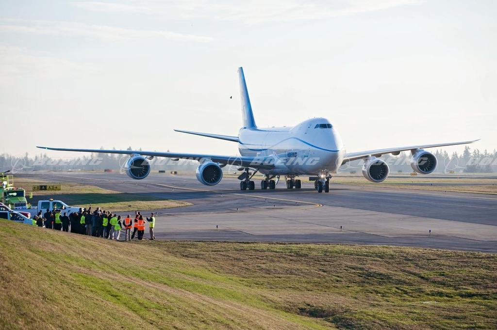 The first flight of the 747-8 Freighter concluded with touchdown at 4:18 p.m. Pacific time Monday at Paine Field in Everett, Wash. Pilots Mark Feuerstein and Tom Imrich smiled and waved as they emerged from the airplane.