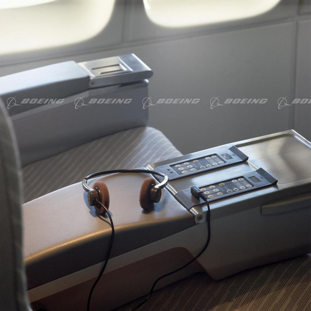 Headphones rest on an inflight entertainment console in the business class cabin of a 747.