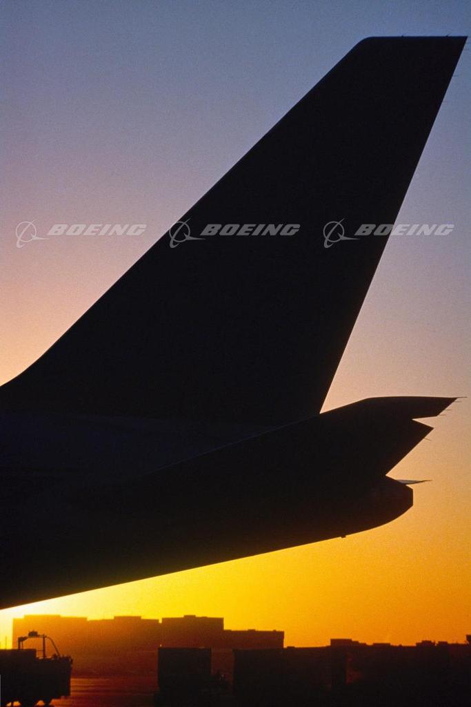 Silhouetted 747-400 Wingtip and Tail at Sunset
