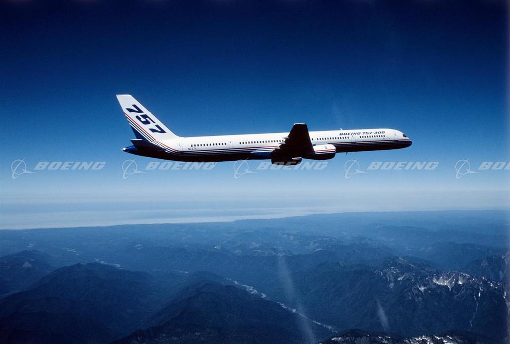 757-300 in Flight with Blue Sky and Snow-Covered Cascade Mountains