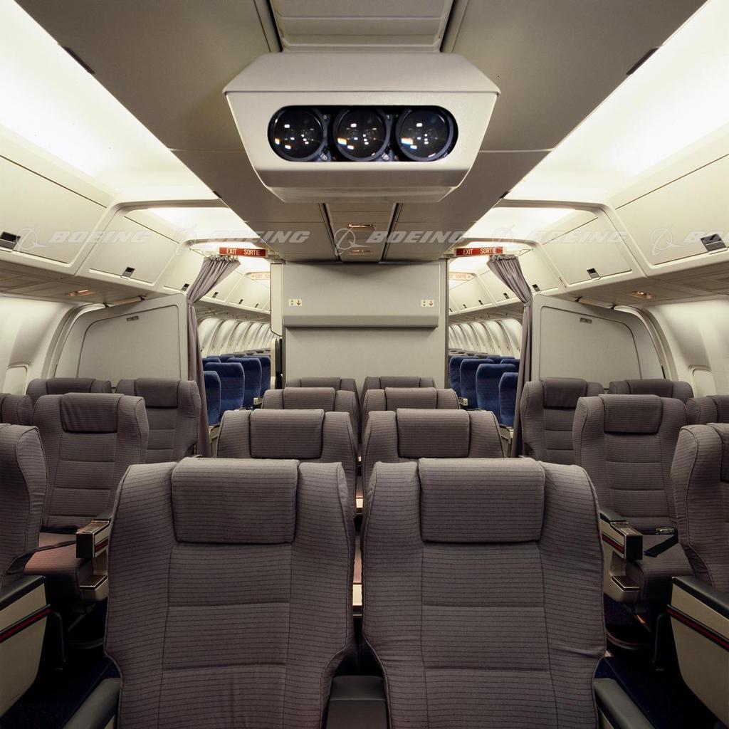 The Boeing 767 business class offers travelers six-abreast seating. This arrangement enables each passenger to sit next to either a window or an aisle. Seating in this section of the cabin is typically set at a 38-inch pitch. The wide seats in this section offer the same comfort as eight-abreast 747 business-class seats. The cabin offers plenty of shoulder room because most carry-on articles can be stowed in the spacious overhead bins.