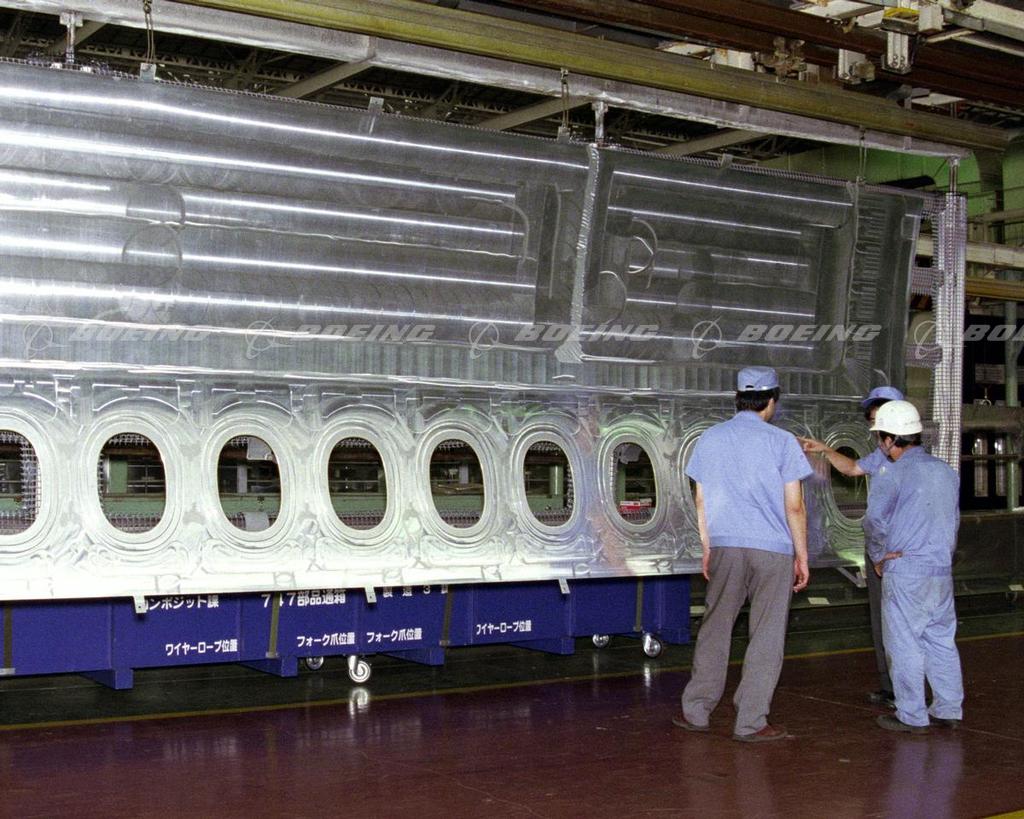 Workers inspect body-skins produced for the new Boeing 767-400ER (extended range) airplane at Mitsubishi Heavy Industries, Nagoya, Japan. Mitsubishi will strengthen the body-skins by adding structural stiffeners. The resulting panel assemblies are used for the airplane section just aft of the wing. The skins showcase the more oval-shaped windows - a highly efficient design that Boeing first used on the 777 airplane. Incorporating the oval window design saves more than 500 pounds per airplane, compared to the earlier 767 design. The 767-400ER, which is 21 feet longer than the 767-300ER, is scheduled to roll out of the Boeing hangar in August 1999.