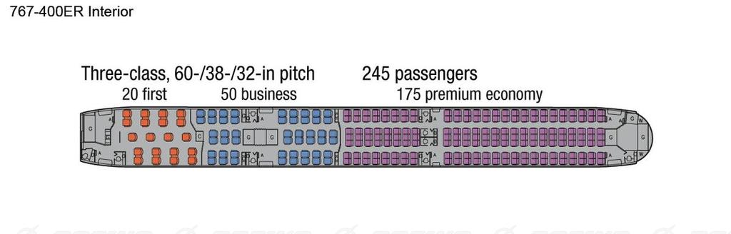 The 767-400ER fuselage adds 11 feet (3.4 m) to the baseline 767-300 airframe. The 767-400ER provides approximately 12 percent more seats -- accommodating 245 passengers in a three-class configuration and 304 passengers in a two-class configuration -- compared with 218 and 269, respectively, in the 767-300 version. The added seats will reduce seat-mile costs relative to the 767-300ER, which already offers airlines the lowest operating costs in its class.