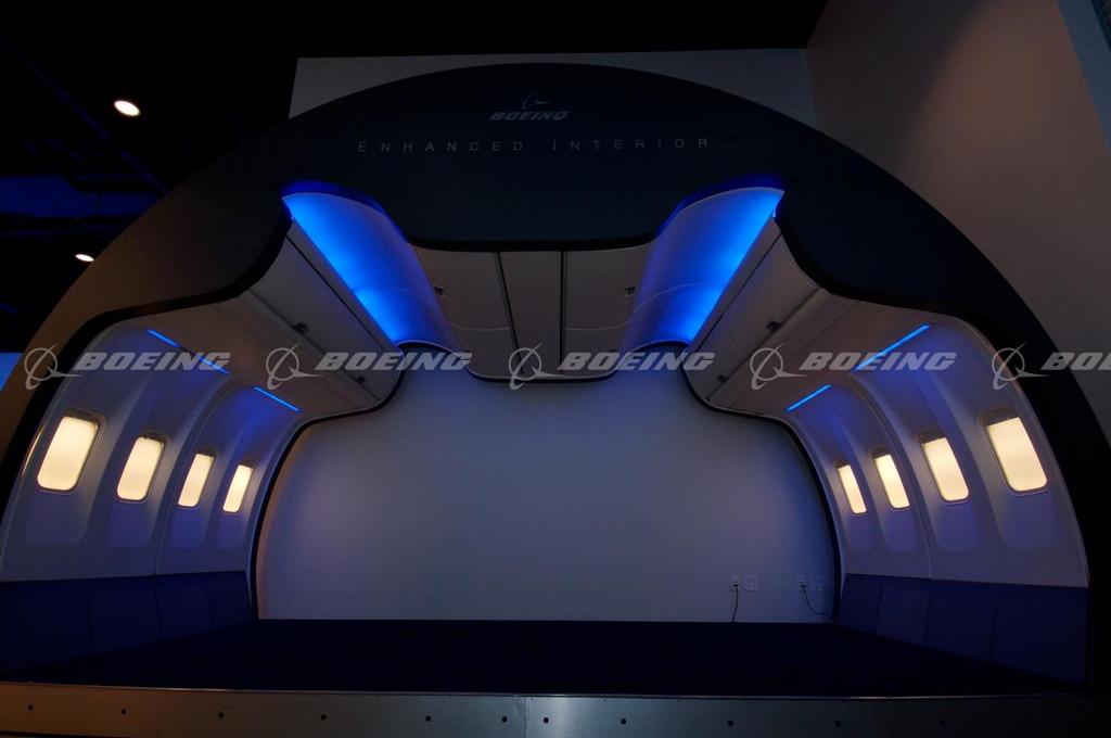 A highlight inside the Customer Experience Center in Renton, WA is the interior arch of a Boeing 767 that projects enhanced interior retrofits. The 767 Enhanced Interior has a similar look and feel to the 767-400, featuring new ceiling panels, centerline bins, and new outboard bin doors.