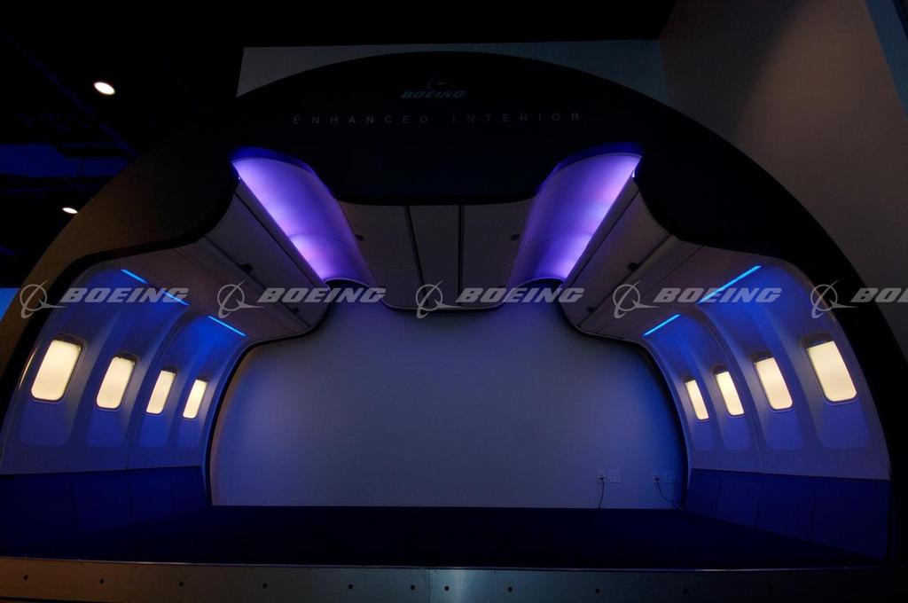 A highlight inside the Customer Experience Center in Renton, WA is the interior arch of a Boeing 767 that projects enhanced interior retrofits. The 767 Enhanced Interior has a similar look and feel to the 767-400, featuring new ceiling panels, centerline bins, and new outboard bin doors.