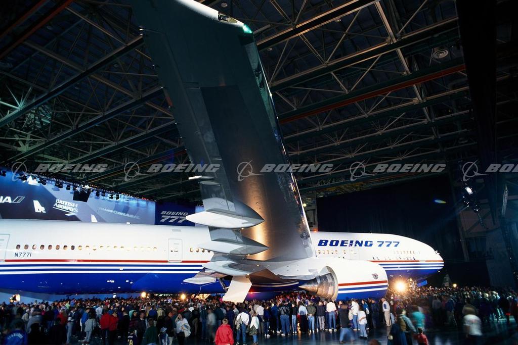 Ceremonial rollout of the first 777. Boeing unveiled the first 777 to approximately 100,000 employees and their guests, customers and suppliers.