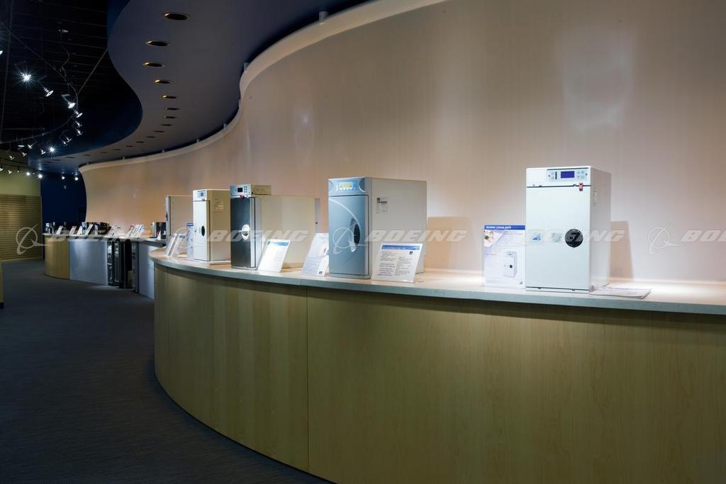 The galley showroom at the 787 Dreamliner Gallery includes pre-certified inserts, such as coffee and espresso makers, ovens, and carts that airline customers can see, touch and even operate in a fully functional kitchen equipped with the same power levels found on an airplane. The Dreamliner Gallery is a showroom in Everett, WA that supports the 787's standardization effort by providing airline customers one place to go to see all of the offerings in the 787 catalog as they configure their airplanes.