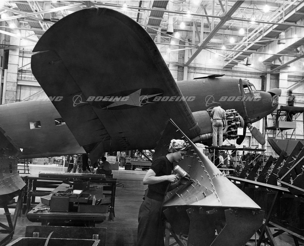 A Douglas "Rosie" in Long Beach Rivets a Boeing B-17 Tail