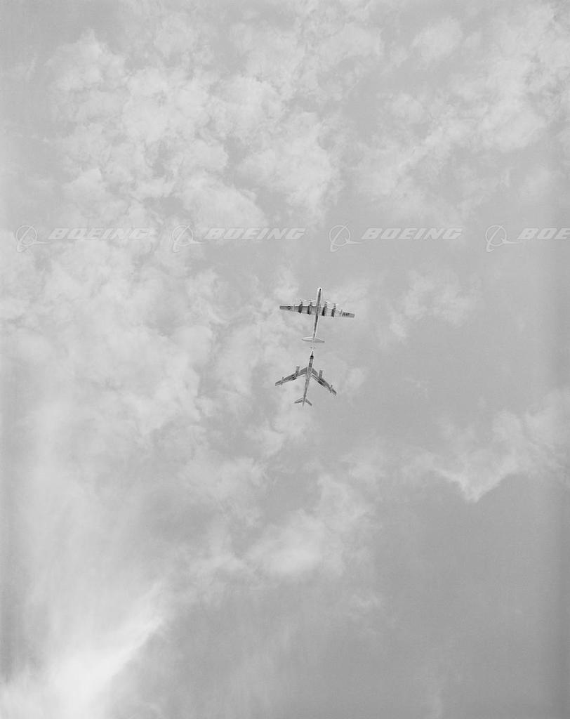 The tanker version of the C-97 Stratofreighter, the KC-97 aerial tanker of 1950, was the prime refueling aircraft of its day and set the stage for future development of the KC-135 jet tanker. Early jet bombers were limited in range, so the Strategic Air Command needed to give them the ability to make intercontinental missions. Equipped with the Boeing-designed “flying boom” refueling system, the double-lobed KC-97s could dispense 8,513 gallons of fuel while carrying 96 troops or heavy equipment.