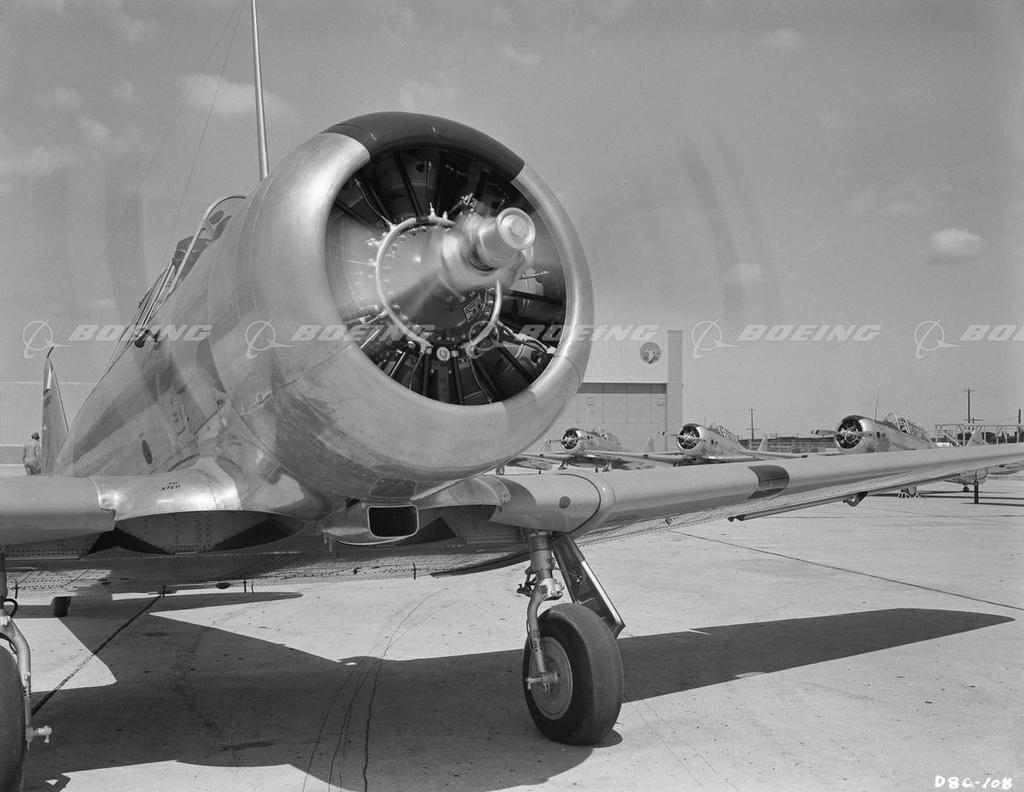 The rugged AT-6 Texan (Harvard) trainers served with American military services for 25 years and in more than 30 other countries. North American Aviation built more than 15,800 Texans and SNJs (the Navy version), beginning in 1938 with the first NA-49 Harvard for the British Royal Air Force. They began delivering the AT-6 to the U.S. Army Air Corps on Feb. 10, 1940. With a wingspan of 42 feet, the trainers, powered by a 550-horsepower engine, could fly 205 mph.
