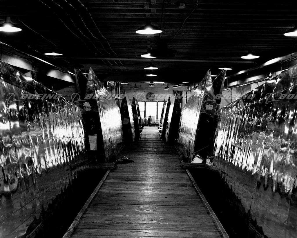 Twin rows of aircraft wings await final assembly, circa 1940s.