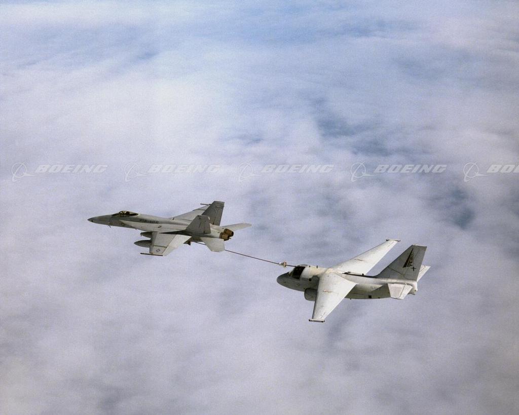 The Super Hornet is shown demonstrating its aerial refuel capability by refueling an S-3 Viking.