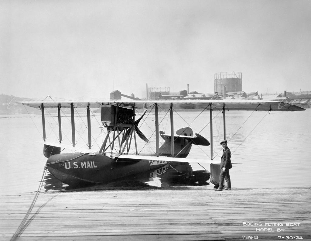 After the war, Boeing designed its first commercial airplane with the vast water areas of the Northwest in mind. The B-1 was a conventional pusher flying boat that could carry a pilot and two passengers as well as mail or cargo. The hull was laminated wood verneer, and the wing frames were spruce and plywood. Although a good airplane, the B-1 did not sell well because the market was overwhelmed with cheap war-surplus aircraft. The only B-1 built was sold to Eddie Hubbard, who was awarded one of the first airmail contracts. Flying more than 350,000 miles over a span of 8 years, the B-1 wore out six engines shuttling mail between Victoria, British Columbia and Seattle.
