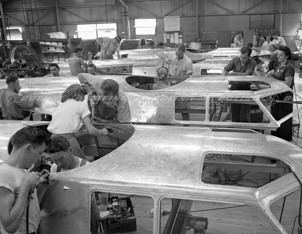 The Allied demand for huge quantities of advanced bombers fueled a rapid increase in production and personnel at Boeing. The large work force of talented engineers and armies of production workers turned out B-17 Flying Fortresses and B-29 Superfortresses in astonishing numbers. Under a unique wartime arrangement, aircraft manufacturers across the country developed techniques for mass production and shared production of the most popular military aircraft, including the B-17s and the B-29s. Thousands of women took up the slack in the work force and helped boost production to an astounding 362 airplanes a month by March 1944.