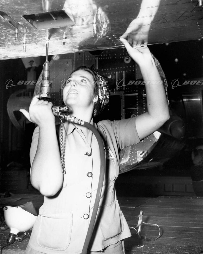 A "Rosie" at Douglas' Long Beach Plant applies rivets to a Boeing B-17 built under a nationwide collaborative effort between Boeing, Douglas and Lockheed Vega.