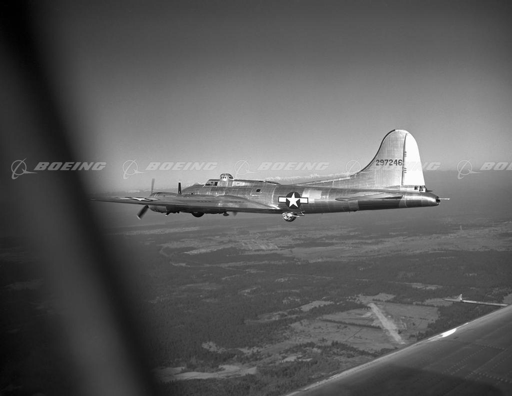 In response for the Army’s request for a large, multiengine bomber, the B-17 (Model 299) prototype, financed entirely by Boeing, went from design to flight test in less than 12 months. The B-17 Flying Fortress was a low-wing monoplane that combined aerodynamic features of the XB-15 giant bomber, and the Model 247 transport. The B-17 was the first Boeing military aircraft with a flight deck instead of an open cockpit and was armed with bombs and five .30-caliber machine guns mounted in clear blisters. Each version of the B-17 was more heavily armed. Described by General H. H. Hap Arnold, as the backbone of our worldwide aerial offensive, the B-17 Flying Fortress served in every World War II combat zone. Boeing, Douglas, and Lockheed Vega produced 12,731 B-17s, and the four-engine bombers became legendary for their ability to stay in the air after taking brutal poundings.