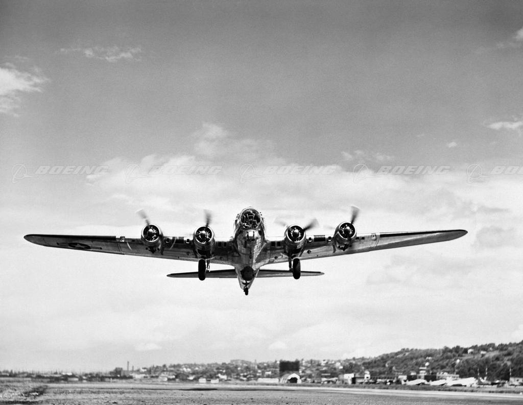 In response for the Army’s request for a large, multiengine bomber, the B-17 (Model 299) prototype, financed entirely by Boeing, went from design to flight test in less than 12 months. The B-17 Flying Fortress was a low-wing monoplane that combined aerodynamic features of the XB-15 giant bomber, and the Model 247 transport. The B-17 was the first Boeing military aircraft with a flight deck instead of an open cockpit and was armed with bombs and five .30-caliber machine guns mounted in clear blisters. Each version of the B-17 was more heavily armed. Described by General H. H. Hap Arnold, as the backbone of our worldwide aerial offensive, the B-17 Flying Fortress served in every World War II combat zone. Boeing, Douglas, and Lockheed Vega produced 12,731 B-17s, and the four-engine bombers became legendary for their ability to stay in the air after taking brutal poundings.