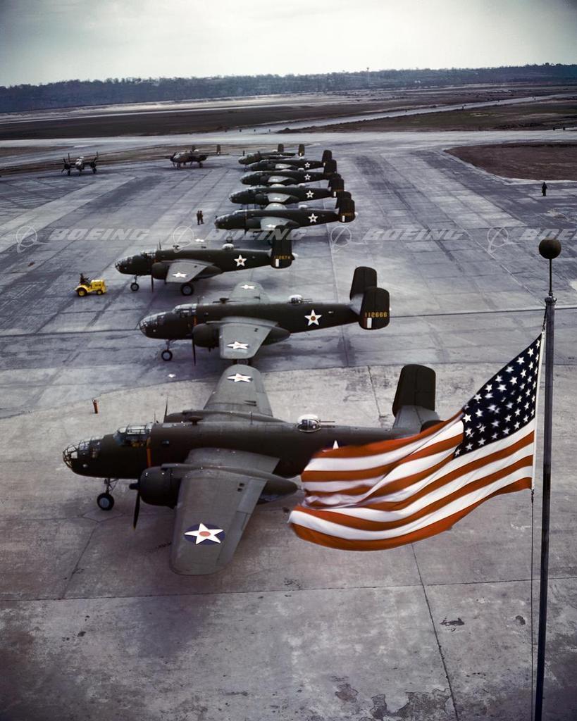 Named after General 'Billy' Mitchell, America's foremost supporter of air power, the B-25 Mitchell first flew on Aug. 19, 1940, and was the first multiengine design to go beyond the prototype stage. North American Aviation built more than 11,000 B-25s for the U.S. Army Air Forces and the U.S. Navy, which called it the PBJ, plus 50 each for China and Great Britain. The B-25 bomber had a wingspan of 67 feet and was 52 feet 11 inches long. One version, the B-25H, was the most heavily armed attack bomber of its time, with a 75-millimeter gun, up to 14 .50 caliber machine guns and 5,000 pounds of bombs carried in an internal bomb bay.