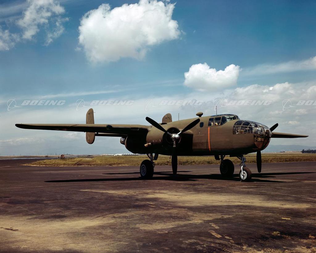 Named after General 'Billy' Mitchell, America's foremost supporter of air power, the B-25 Mitchell first flew on Aug. 19, 1940, and was the first multiengine design to go beyond the prototype stage. North American Aviation built more than 11,000 B-25s for the U.S. Army Air Forces and the U.S. Navy, which called it the PBJ, plus 50 each for China and Great Britain. The B-25 bomber had a wingspan of 67 feet and was 52 feet 11 inches long. One version, the B-25H, was the most heavily armed attack bomber of its time, with a 75-millimeter gun, up to 14 .50 caliber machine guns and 5,000 pounds of bombs carried in an internal bomb bay.