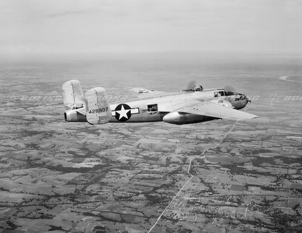 Named after General “Billy” Mitchell, America’s foremost supporter of air power, the B-25 Mitchell first flew on Aug. 19, 1940, and was the first multi-engine design to go beyond the prototype stage. North American Aviation built more than 11,000 B-25s for the U.S. Army Air Forces and the U.S. Navy, which called it the PBJ, plus 50 each for China and Great Britain. The B-25 bomber had a wingspan of 67 feet and was 52 feet 11 inches long. One version, the B-25H, was the most heavily armed attack bomber of its time, with a 75-millimeter gun, up to 14 .50 caliber machine guns and 5,000 pounds of bombs carried in an internal bomb bay.