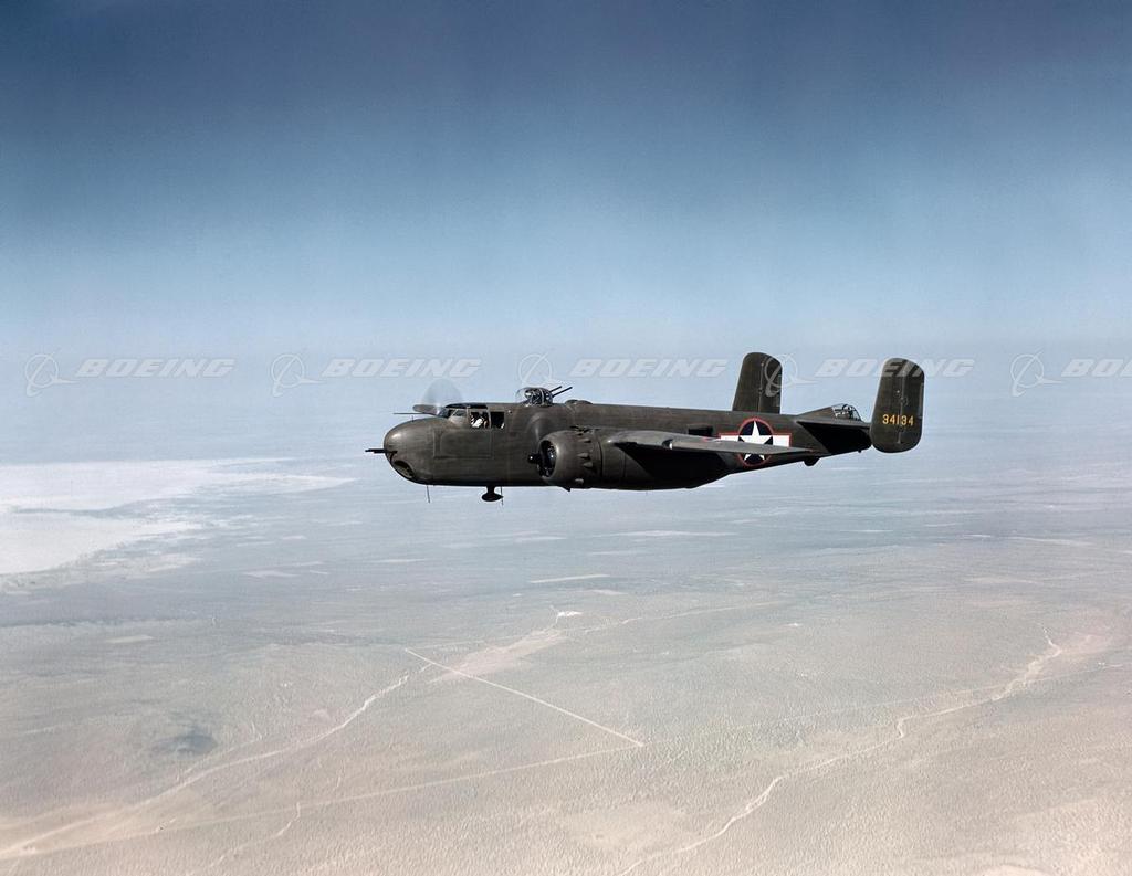 Named after General 'Billy' Mitchell, America's foremost supporter of air power, the B-25 Mitchell first flew on Aug. 19, 1940, and was the first multiengine design to go beyond the prototype stage. North American Aviation built more than 11,000 B-25s for the U.S. Army Air Forces and the U.S. Navy, which called it the PBJ, plus 50 each for China and Great Britain. The B-25 bomber had a wingspan of 67 feet and was 52 feet 11 inches long. One version, the B-25H, was the most heavily armed attack bomber of its time, with a 75-millimeter gun, up to 14 .50 caliber machine guns and 5,000 pounds of bombs carried in an internal bomb bay.