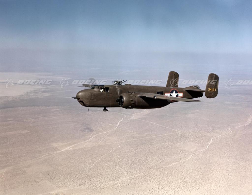 Named after General 'Billy' Mitchell, America's foremost supporter of air power, the B-25 Mitchell first flew on Aug. 19, 1940, and was the first multiengine design to go beyond the prototype stage. North American Aviation built more than 11,000 B-25s for the U.S. Army Air Forces and the U.S. Navy, which called it the PBJ, plus 50 each for China and Great Britain. The B-25 bomber had a wingspan of 67 feet and was 52 feet 11 inches long. One version, the B-25H, was the most heavily armed attack bomber of its time, with a 75-millimeter gun, up to 14 .50 caliber machine guns and 5,000 pounds of bombs carried in an internal bomb bay.