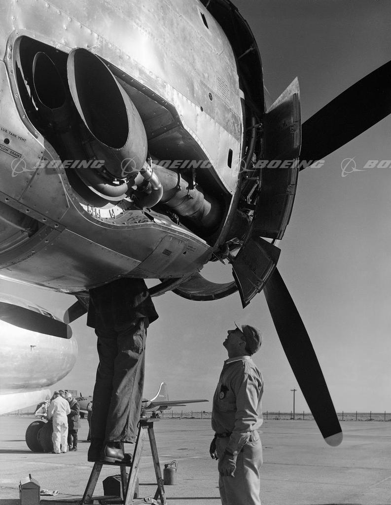 Mechanic Servicing a B-29 Superfortress, Dwarfed by Propeller