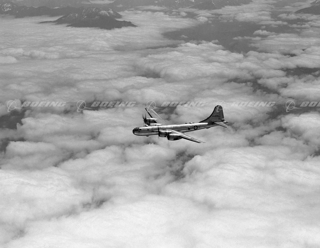The Boeing B-29 Superfortress, the most technologically advanced airplane produced during World War II, first flew Sept. 21, 1942. The B-29 had many new features, including guns that could be fired by remote control. The crew areas were pressurized and connected by a long tube over the bomb bays. The tail gunner had a separate pressurized area that could only be left during unpressurized flight. At 105,000 pounds, the B-29 was also the heaviest production plane because of increases in range, bomb load and defensive requirements. The B-29 used the high-speed Boeing 117 airfoil, and its larger Fowler flaps added to the wing area as they increased lift. Modifications led to the B-29D, upgraded to the B-50, and the RB-29 photo reconnaissance aircraft. The Soviet-built copy of the B-29 was called the Tupolev Tu-4. A total of 3,970 B-29s were built.