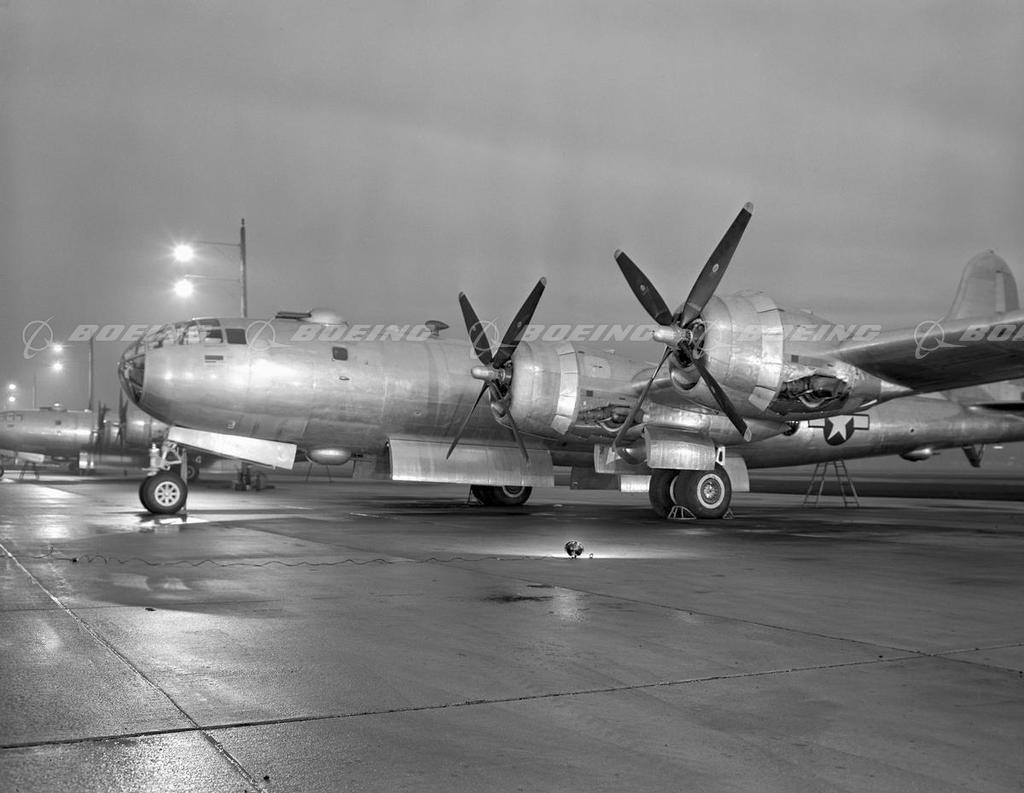 The Boeing B-29 Superfortress, the most technologically advanced airplane produced during World War II, first flew Sept. 21, 1942. The B-29 had many new features, including guns that could be fired by remote control. The crew areas were pressurized and connected by a long tube over the bomb bays. The tail gunner had a separate pressurized area that could only be left during unpressurized flight. At 105,000 pounds, the B-29 was also the heaviest production plane because of increases in range, bomb load and defensive requirements. The B-29 used the high-speed Boeing 117 airfoil, and its larger Fowler flaps added to the wing area as they increased lift. Modifications led to the B-29D, upgraded to the B-50, and the RB-29 photo reconnaissance aircraft. The Soviet-built copy of the B-29 was called the Tupolev Tu-4. A total of 3,970 B-29s were built.