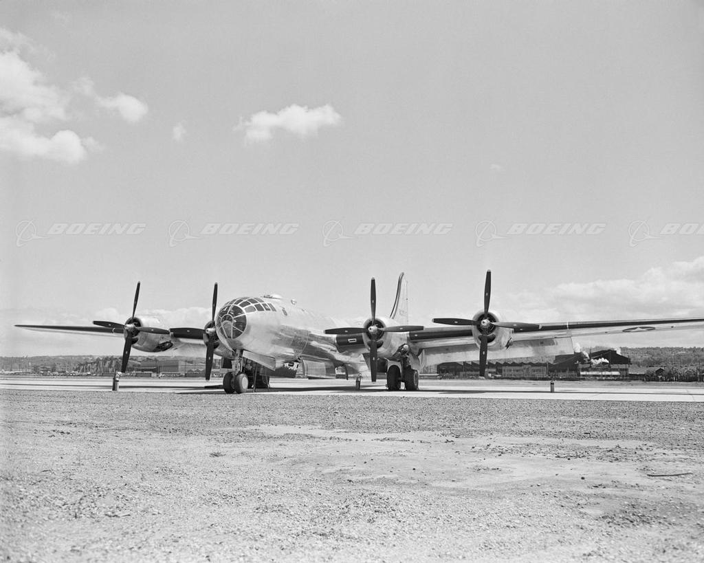 The Boeing B-29 Superfortress, the most technologically advanced airplane produced during World War II, first flew Sept. 21, 1942. The B-29 had many new features, including guns that could be fired by remote control. The crew areas were pressurized and connected by a long tube over the bomb bays. The tail gunner had a separate pressurized area that could only be left during unpressurized flight. At 105,000 pounds, the B-29 was also the heaviest production plane because of increases in range, bomb load and defensive requirements. The B-29 used the high-speed Boeing 117 airfoil, and its larger Fowler flaps added to the wing area as they increased lift. Modifications led to the B-29D, upgraded to the B-50, and the RB-29 photo reconnaissance aircraft. The Soviet-built copy of the B-29 was called the Tupolev Tu-4. A total of 3,970 B-29s were built.