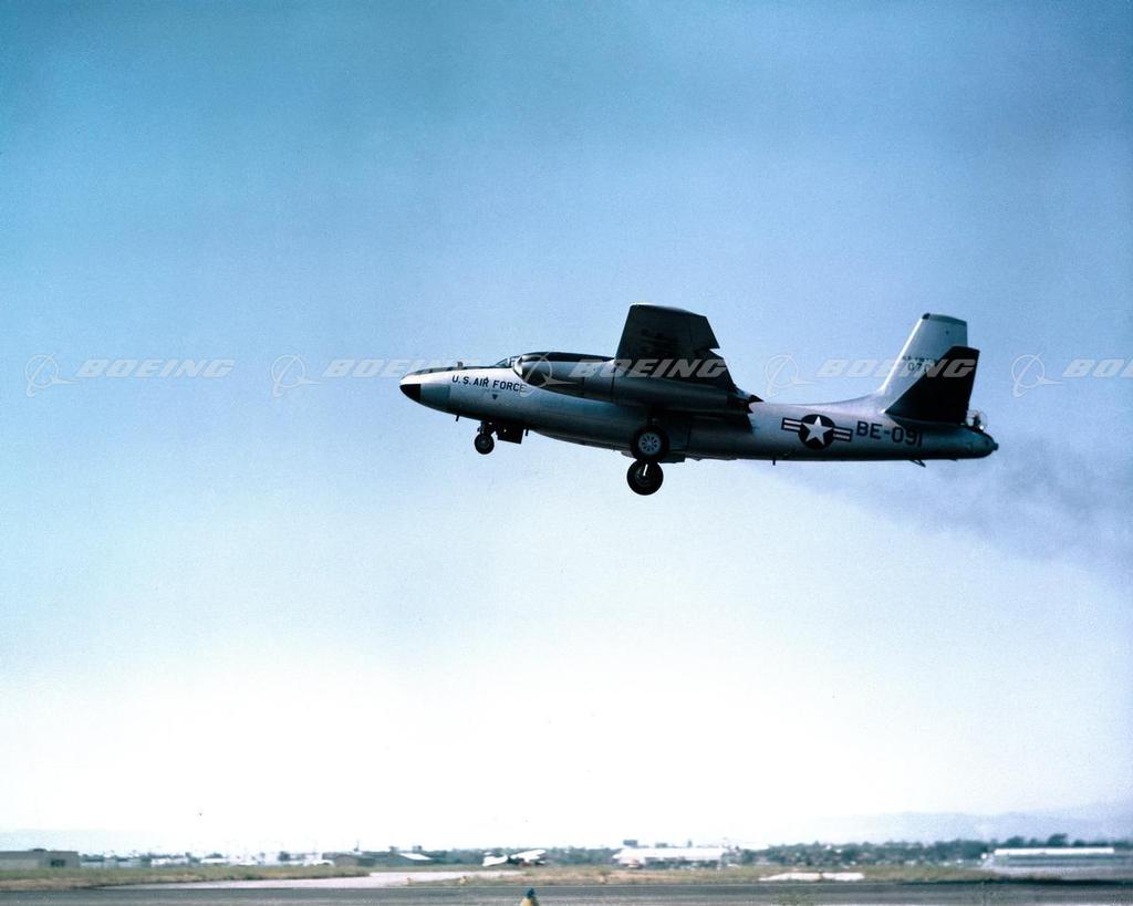 North American Aviation's straight-wing B-45 Tornado, designed during 1944 and 1945, first flew in February 1947. It was the first jet bomber in service with the Air Force and the first four-jet airplane to fly in the United States. Versions included the longer-range B-45C with wingtip tanks and the photoreconnaissance version, the RB-45C. Rated as a light bomber by modern-day standards, it was the first four-jet aircraft to drop an atom bomb and the first to be refueled in midair. It had a wingspan of 89 feet, and it was 75 feet 11 inches long.