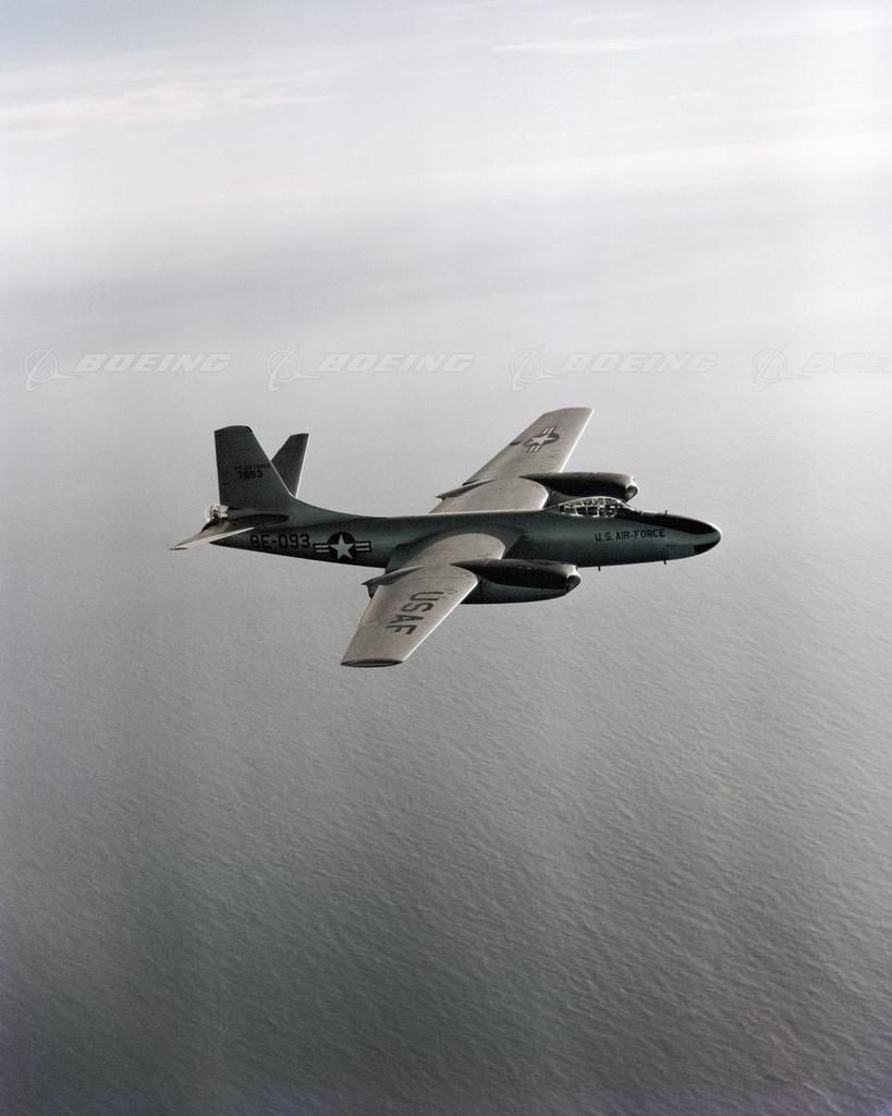 North American Aviation's straight-wing B-45 Tornado, designed during 1944 and 1945, first flew in February 1947. It was the first jet bomber in service with the Air Force and the first four-jet airplane to fly in the United States. Versions included the longer-range B-45C with wingtip tanks and the photoreconnaissance version, the RB-45C. Rated as a light bomber by modern-day standards, it was the first four-jet aircraft to drop an atom bomb and the first to be refueled in midair. It had a wingspan of 89 feet, and it was 75 feet 11 inches long.