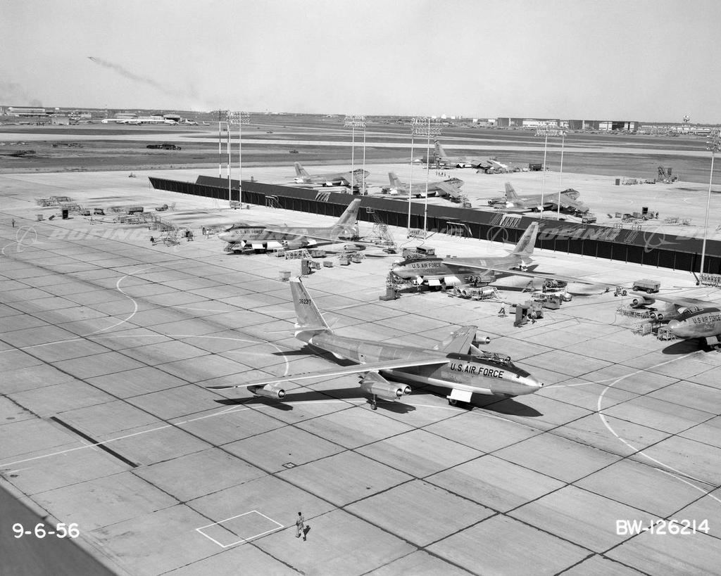 At the time of its first flight, Dec. 17, 1947, the B-47 Stratojet represented a radical departure from traditional design, and it set the design standards for all large jet aircraft until the present time. The six-engine Boeing B-47 was America's first multiengine swept-wing jet bomber. Its thin 116-foot wing was extraordinarily flexible and swept back at a 35-degree angle. Eighteen small rocket units in the fuselage provided jet-assisted takeoff (JATO), and parachutes cut its landing speeds. Later models were powered by 5,200-pound-thrust axial-flow jet engines, and top speeds were 600 mph. A total of 2,032 B-47s in all versions were built.
