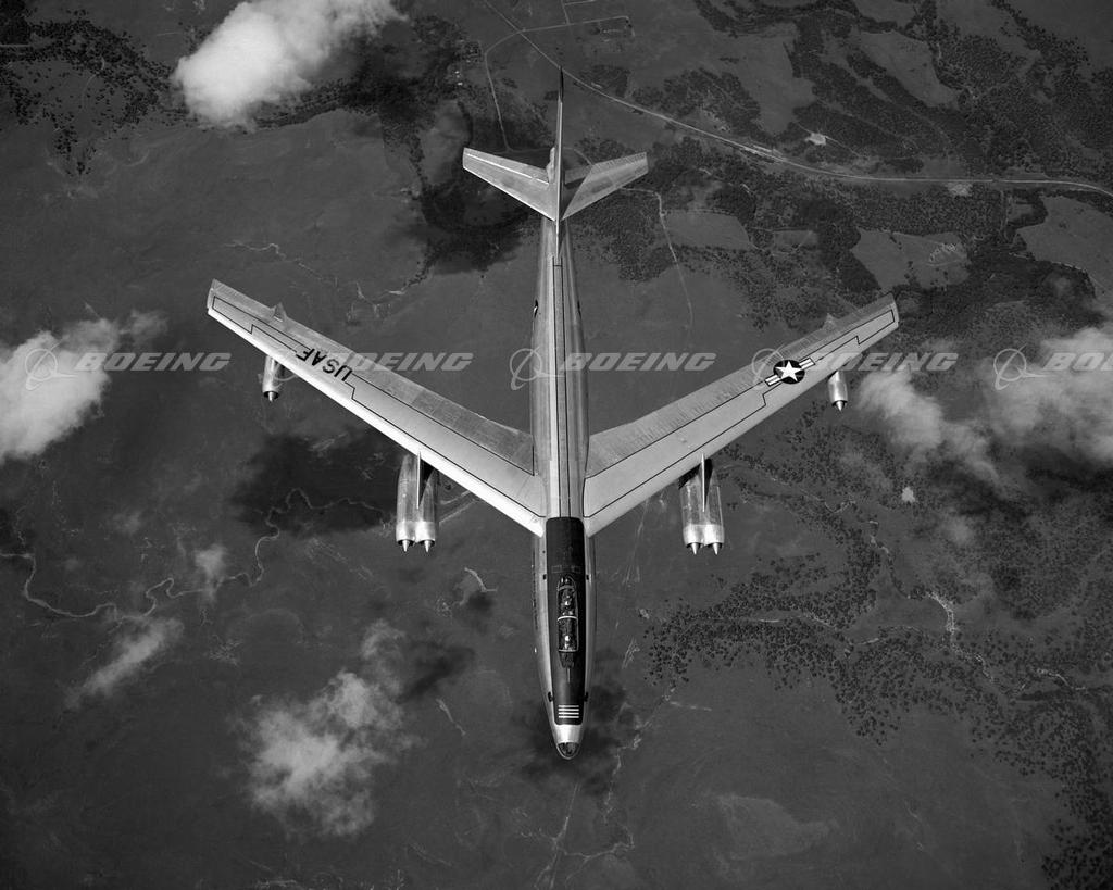 At the time of its first flight, Dec. 17, 1947, the B-47 Stratojet represented a radical departure from traditional design, and it set the design standards for all large jet aircraft until the present time. The six-engine Boeing B-47 was America's first multiengine swept-wing jet bomber. Its thin 116-foot wing was extraordinarily flexible and swept back at a 35-degree angle. Eighteen small rocket units in the fuselage provided jet-assisted takeoff (JATO), and parachutes cut its landing speeds. Later models were powered by 5,200-pound-thrust axial-flow jet engines, and top speeds were 600 mph. A total of 2,032 B-47s in all versions were built.