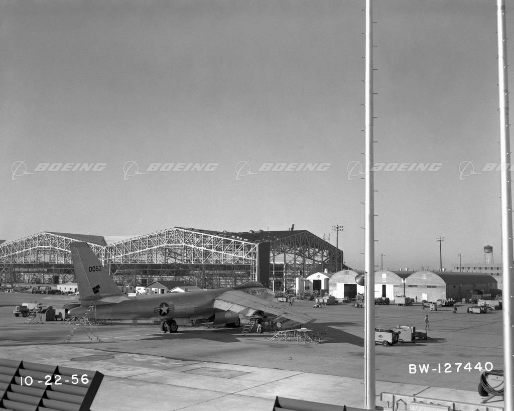 At the time of its first flight, Dec. 17, 1947, the B-47 Stratojet represented a radical departure from traditional design, and it set the design standards for all large jet aircraft until the present time. The six-engine Boeing B-47 was America's first multiengine swept-wing jet bomber. Its thin 116-foot wing was extraordinarily flexible and swept back at a 35-degree angle. Eighteen small rocket units in the fuselage provided jet-assisted takeoff (JATO), and parachutes cut its landing speeds. Later models were powered by 5,200-pound-thrust axial-flow jet engines, and top speeds were 600 mph. A total of 2,032 B-47s in all versions were built.