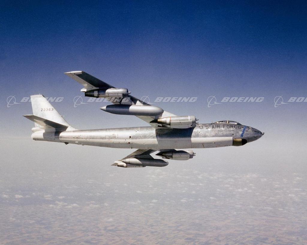 At the time of its first flight, Dec. 17, 1947, the B-47 Stratojet represented a radical departure from traditional design, and it set the design standards for all large jet aircraft until the present time. The six-engine Boeing B-47 was America's first multiengine swept-wing jet bomber. Its thin 116-foot wing was extraordinarily flexible and swept back at a 35-degree angle. Eighteen small rocket units in the fuselage provided jet-assisted takeoff (JATO), and parachutes cut its landing speeds. Later models were powered by 5,200-pound-thrust axial-flow jet engines, and top speeds were 600 mph. A total of 2,032 B-47s in all versions were built.